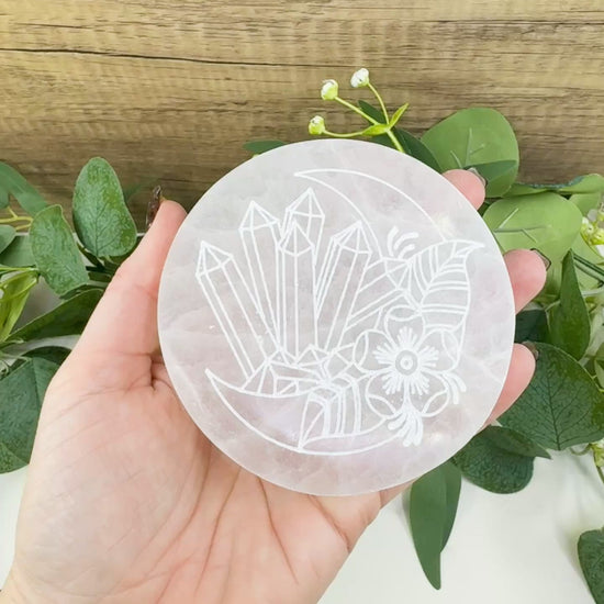 4" Engraved Selenite Charging Plate – Crystal Moon & Flower Cleansing Station for Gemstones & Jewelry