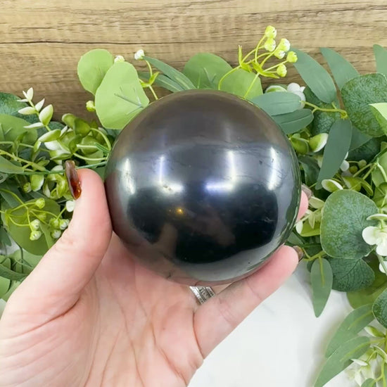 Anchor your energy and harmonize your environment with the profound power of this Polished Shungite Sphere. Known as the "Miracle Stone of the 21st Century," Shungite is an ancient, carbon-rich mineral estimated to be nearly two billion years old. This substantial sphere is masterfully polished to a deep, metallic charcoal luster, showcasing the natural veins and unique character of the stone. Beyond its sleek, modern aesthetic, Shungite is highly prized in the metaphysical community for its unparalleled ability to absorb and neutralize negative frequencies, making it an essential companion for any tech-heavy home or office space.