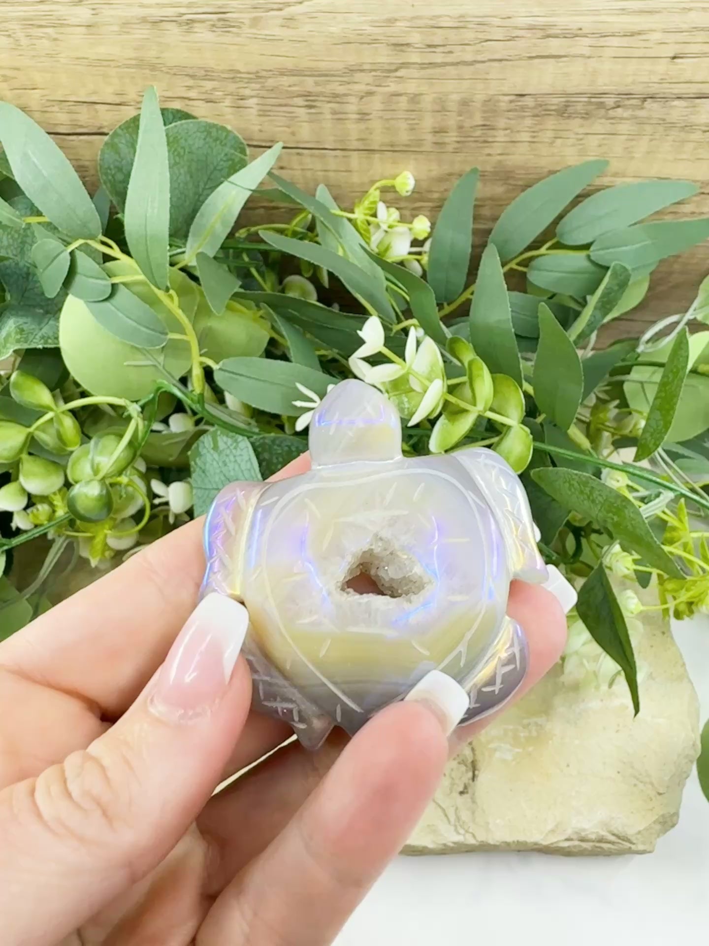 Agate promotes emotional healing, protection, and inner stability, while the aura treatment adds spiritual elevation, transformation, and joy. The turtle symbolizes wisdom, strength, and long-lasting protection, making it a meaningful and beautiful addition to any crystal collection.