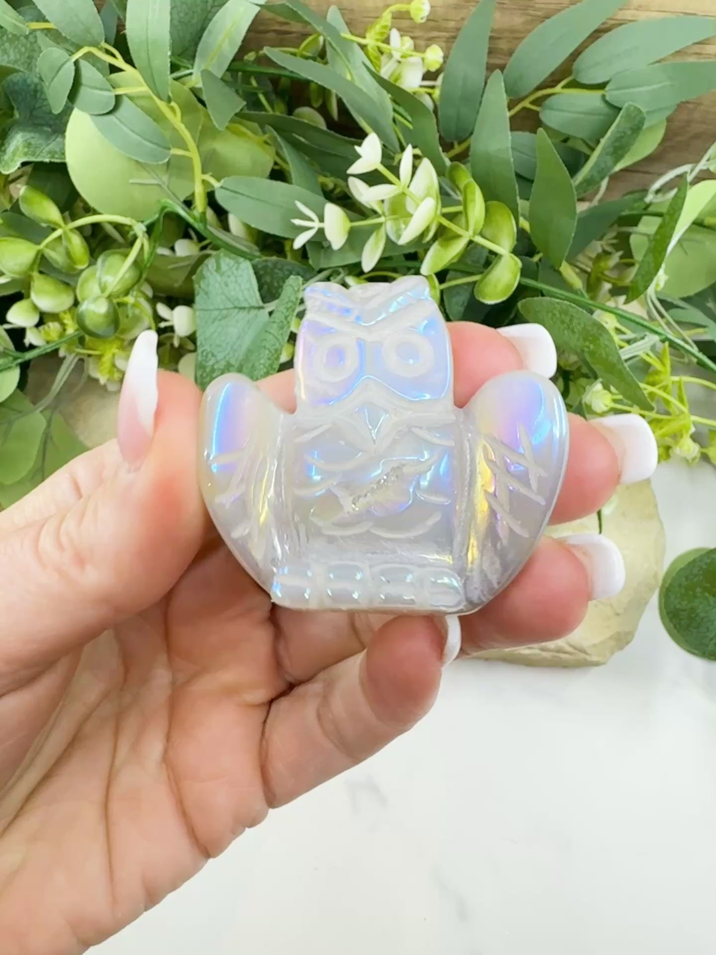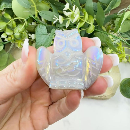 Channel the energy of clarity and insight with this enchanting Aura Quartz Owl Carving No. 3. Measuring approximately 1.8" x 1.9" x 0.6", this compact crystal sculpture glows with rainbow iridescence — a magical shimmer that catches the light and captivates the spirit.