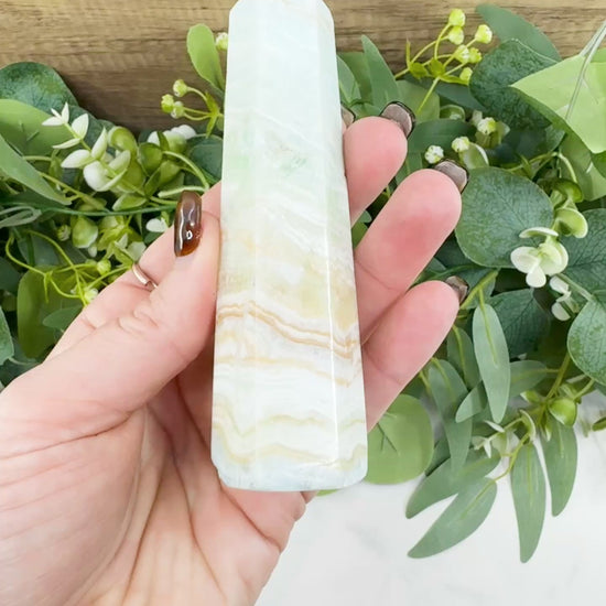 Channel deep serenity and spiritual clarity with the Caribbean Calcite Hexagonal Tower (Specimen No. 2). This breathtaking polished point showcases the rare combination of Sky Blue Calcite and sandy-hued Aragonite, perfectly mirroring the peaceful aesthetic of a tropical shoreline. This specific specimen features elegant, horizontal wavy banding and a refined hexagonal shape, making it a powerful focal point for energy work or a sophisticated addition to your crystal collection. Known for its high-vibrational "cool" energy, this tower acts as a lighthouse of tranquility in any space.