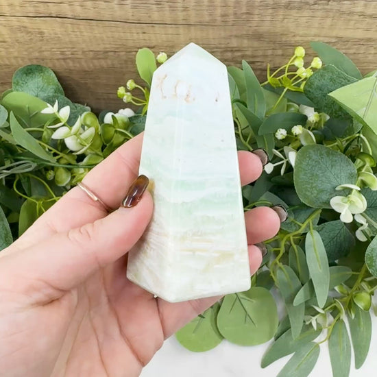 Invite a tranquil, coastal vibration into your sacred space with the Caribbean Calcite Obelisk Tower (Specimen No. 2). This substantial four-sided polished point is a masterwork of natural artistry, featuring the serene combination of Sky Blue Calcite and sandy-hued Aragonite. This specific specimen boasts intricate, wavy "surf and sand" banding that wraps entirely around its geometric form. Known as a high-vibrational stone of emotional healing, this obelisk serves as a powerful conduit for peace, helping to clear the mind of daily stress and anchor your intentions in a state of calm clarity.