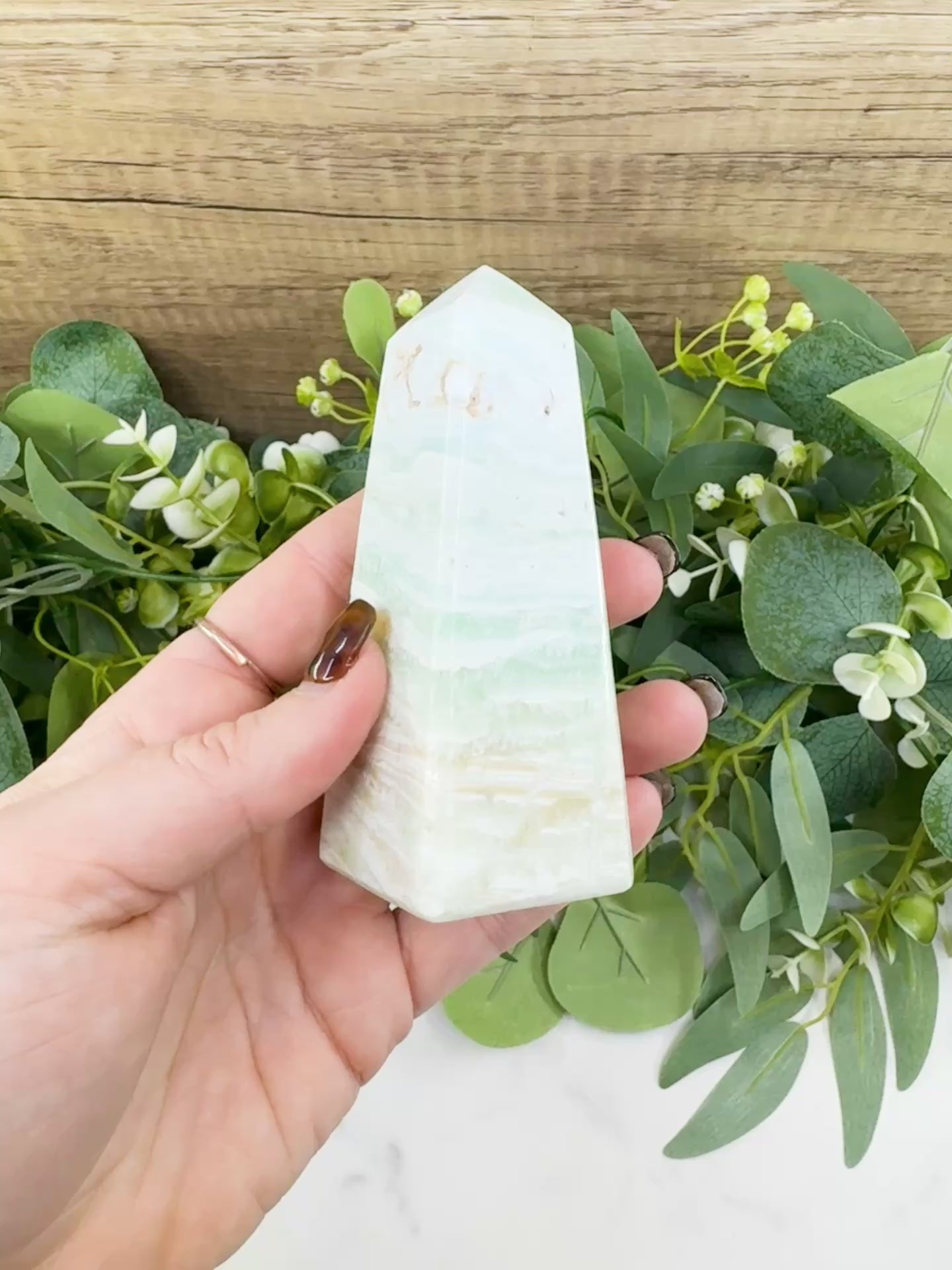 - Care: Clean with a soft, dry cloth. Calcite is a soft mineral; avoid exposure to water, acids, or harsh chemicals to protect the natural polished finish.