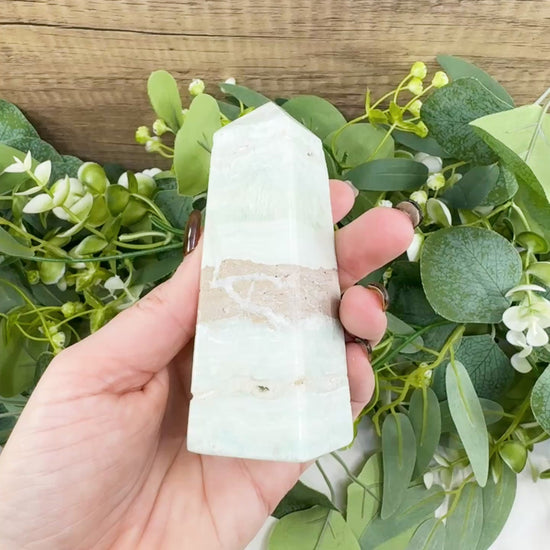 Restore harmony and tranquility to your sacred space with the Caribbean Calcite Obelisk Tower (Specimen No. 3). This striking four-sided polished point captures the essence of a serene tropical getaway, blending layers of Sky Blue Calcite with earthy Aragonite. This specific specimen is highly unique, featuring a distinct sandy band of Aragonite that wraps around the center of the tower, beautifully contrasted by icy mint and sea-foam blue layers. As a stone of deep emotional soothing, this obelisk is a perfect companion for those seeking to quiet the mind and enhance their spiritual connection.