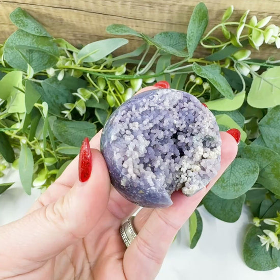 Step into a world of celestial calm with this stunning Grape Agate Sphere (Specimen No. 1). Not a true agate, but rather a rare form of botryoidal purple Chalcedony found exclusively in the Mamuju region of Indonesia, Grape Agate is prized for its unique, bubble-like clusters that resemble a bunch of grapes. This 55mm sphere has been expertly polished to reveal a breathtaking geode-like interior, shimmering with thousands of tiny, sparkling druzy crystals. Weighing 4.7oz, this specimen is a powerhouse for those seeking to enhance their intuition and connect with higher realms of consciousness.