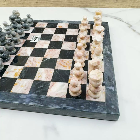Experience the classic game of kings in a masterfully crafted, compact format. This 7.75-inch chess set is hand-carved in Mexico from authentic Onyx (Banded Calcite), delivering the significant heft and premium, cold-to-the-touch feel distinctive of high-quality stone. The board showcases a bold, high-contrast battlefield of deep midnight black and beautifully veined rose pink squares. Every individual piece is an artisan-crafted original, highlighting the unique natural banding and crystallization of the earth. This set is the perfect tactical accessory for travel or a sophisticated luxury accent for smaller executive desks and home offices.