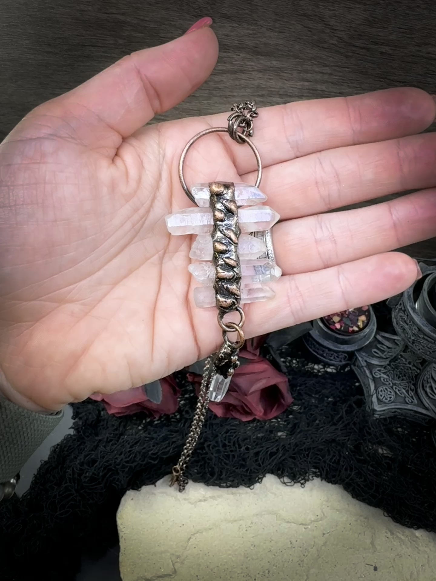 Each quartz crystal is naturally irregular, giving the pendant a unique, organic look. Set in warm-toned copper, this necklace beautifully blends rustic artisan style with the high vibrational energy of clear quartz.