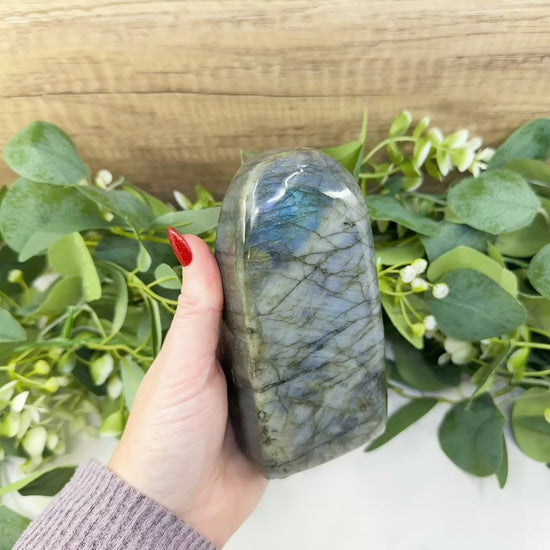 Unveil powerful energy with this stunning Labradorite Free Form, measuring 5.3″ × 3.5″ × 1.8″ and weighing 2.18 lb. Expertly polished with a freestanding base, this piece displays bold flashes of blue, green, gold, and violet labradorescence that dance across its surface with changing light.