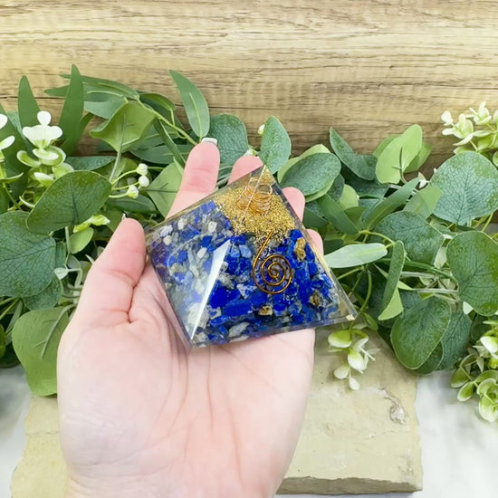 This handcrafted pyramid blends natural lapis lazuli chips, metal matrix, and durable resin into a powerful energy tool. The clear quartz apex amplifies the lodge’s energetic field — ideal for meditation, chakra work, intention‑setting, or simply harmonizing the energy in your home or office.