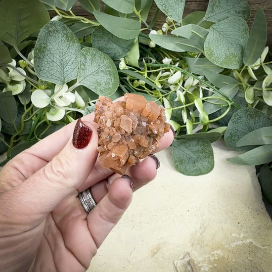 This Moroccan aragonite star specimen weighs about 66 grams and measures 1.9″ × 1.5″ × 1.5″. Compact yet expressive, it displays radiating crystal clusters that mimic miniature stars. The compact form makes it great for intimate spaces or travel altars, while still offering strong grounding energy.