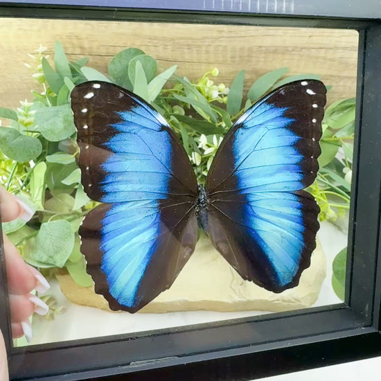 Showcasing the vibrant beauty of nature, this Morpho Achilles Butterfly Display – No. 2 features a real preserved butterfly with shimmering blue and black wings, delicately mounted in a 6.6" x 7.1" black wood and glass frame. With a wing span of approximately 3.8" x 4.1", this piece is ideal for wall art, natural history collections, or meaningful décor.