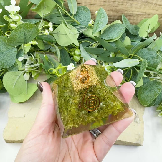 Invite vibrant, heart-centered energy into your space with this handcrafted Peridot Orgonite Pyramid, topped with a genuine clear quartz point. Known as a stone of renewal and abundance, peridot supports emotional healing, fresh growth, and the release of old energetic patterns.