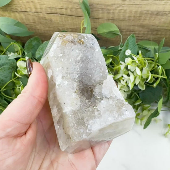 - Suggested Placement: Place in a central location to amplify the energy of other crystals, or on a windowsill where natural light can illuminate the sparkling druzy interior.