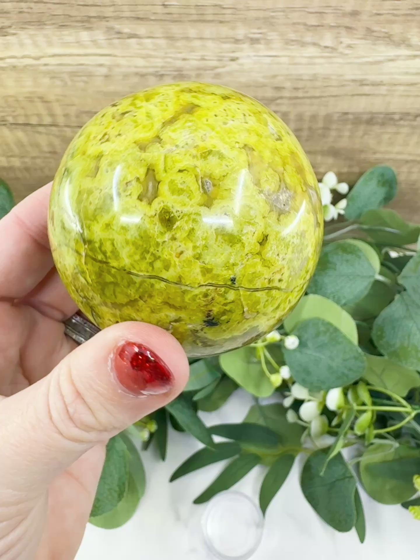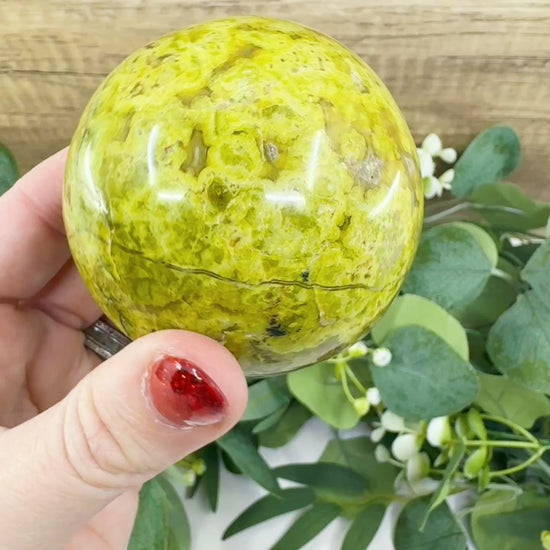Invite the soothing, revitalizing energy of nature into your home with this exquisite Green Opal Sphere. Madagascar Green Opal, also known as Common Opal, is celebrated for its lush shades of fern and moss green, often accented by dark dendritic inclusions that resemble ancient forests. This 360g sphere has been polished to a smooth, glass-like finish, making it a tactile joy to hold during meditation or a stunning decorative accent for any space. As a stone strongly connected to the Heart Chakra, it serves as a gentle emotional support, helping to clear old burdens and refresh your spirit with optimism and growth.