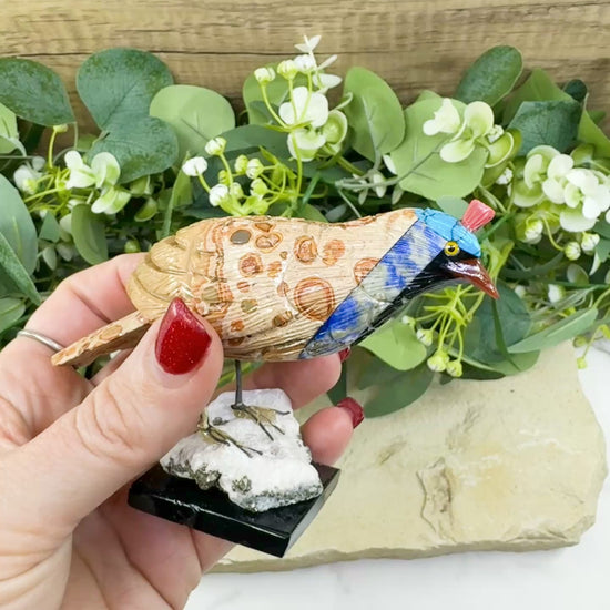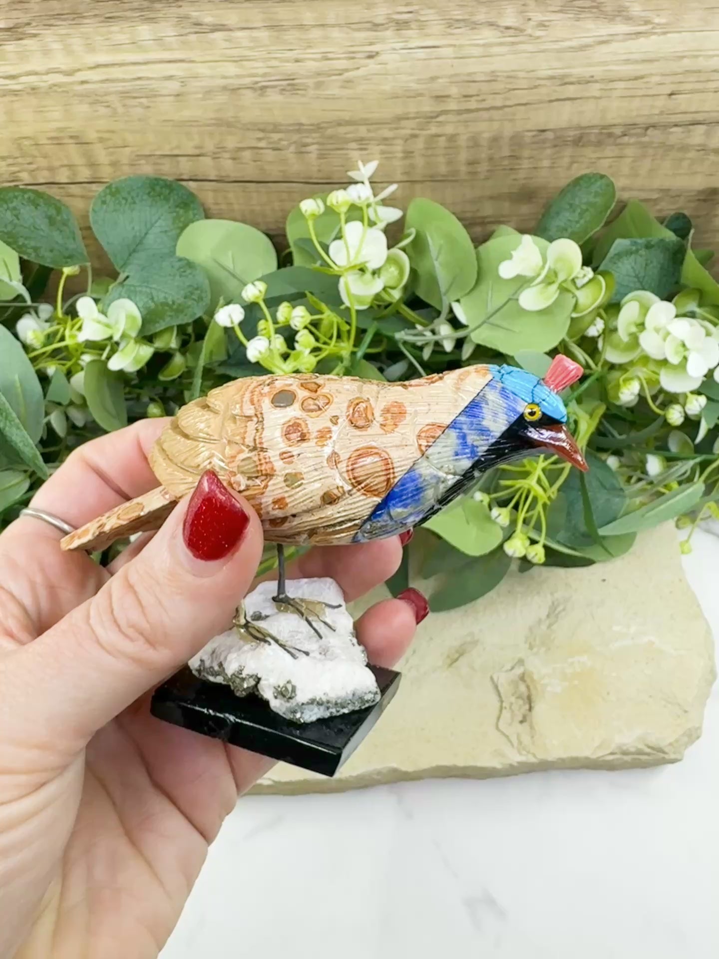 This striking Quail Multi‑Stone Carving No. 1 measures approximately 3.4″ × 4.6″ × 2″ and weighs around 6 oz. The figurine features a beautifully hand‑carved quail form crafted from multiple stones, showcasing rich color variation and intricate detailing. Mounted on a natural matrix base, it’s a one-of-a-kind piece that combines artistic skill with the natural beauty of the materials.
