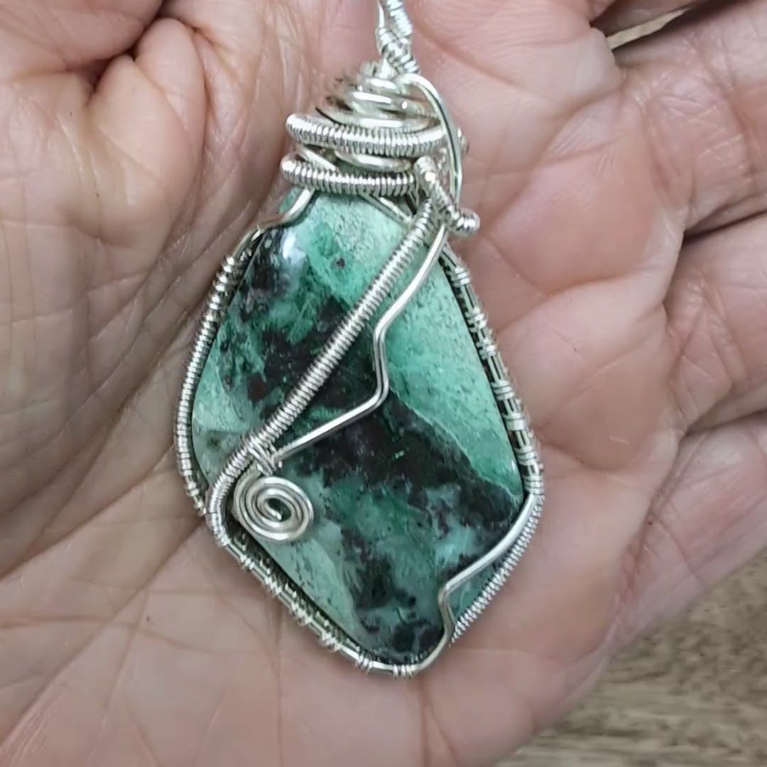 A green and black mottled chrysocolla wrapped in silver wire, with intricate coiling that adds depth and movement. It evokes the mystery of mossy woods and ancient stones. 2.25 x 1.25 inch (5.72 x 3.175 cm) pendant with 21-inch (53.34 cm) chain